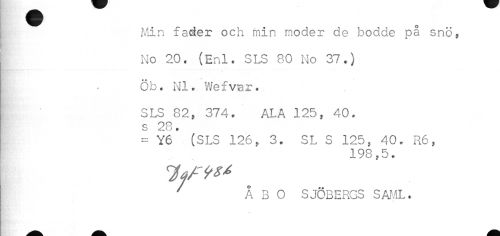 //// Min fader och min moder de bodde på snö, No 20. (Enl. SLS 80 No 37.) Öb. NI. Wefvar. //// SLS 82, 374. ALA 125, 40. //// s 28. //// = Y6 (SLS 126,, 3. SL S 125, 40. R6, //// 198,5. //// 'k BO SJÖBERGS SAML. //// .-i ////