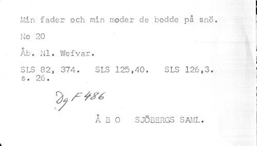 //// Min fader och min moder de bodde på snö. No 20 //// Åb. NI. Wefvar. ' //// ¦ //// i //// SLS 82, 374. SLS 125,40. SLS 126,3. 1 //// s. 26. //// ÅBO SJÖBERGS SAML. //// j //// 1, ////
