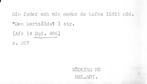 //// I //// Min fader och min moder de hafva lidit nöd. "Den bortsålda" 1 str. (Afz 14 Dgf. 486) s. 267 //// SÖDLING MS MEL.NOT. ////