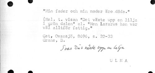 //// "Min fader och min moder äro.döda." //// (Mel. t. visan "Det växte upp en lilja i grön clalen" el. "Men lazarus han var väl alltför fattig." //// Gst, Ovansjö, 8696, s. 32-33 Grane, B. //// U L M A ////