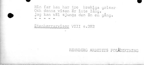 //// Min far han har tre brokiga grisar Och denna visan är Inte lång. | jag kan väl sjunga den än en gång. //// * //// St e nb orrarvisor VIII s.282 //// I //// REHNBERG ARBETETS FOLKDIKTNING //// i ////