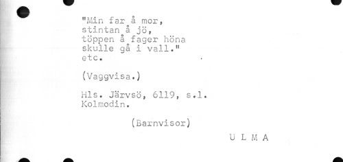 //// "Min far å mor, stintan å jöf toppen å fager höna skulle gå i vall.11 etc. //// (Vaggvisa.) //// Hls. Jarvsö, 6119, s.l. I Kolmodin. //// jJS //// (Barnvisor) //// U L M A ////