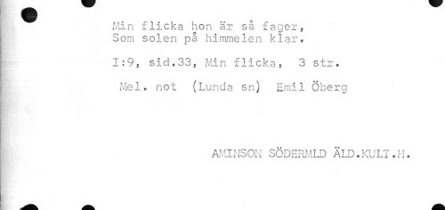 //// | Min flicka hon är så fager, //// Som solen på himmelen klar. //// 1:9, sid.33, Min flicka, 3 str. //// Mel. not (Lunda sn) Emil Öberg //// AMINSON SÖDERMLD ÄLD.KULT.H. ////