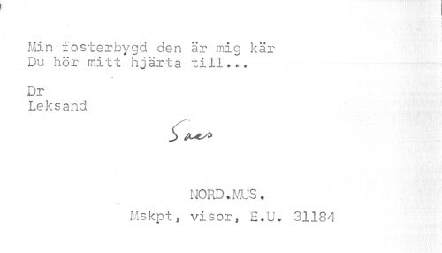 //// ; i //// Min fosterbygd den är mig kär Du hör mitt hjärta till... //// Dr //// Leksand //// t //// NORD.MUS. Mskpt, visor, E.U. 31184 ////