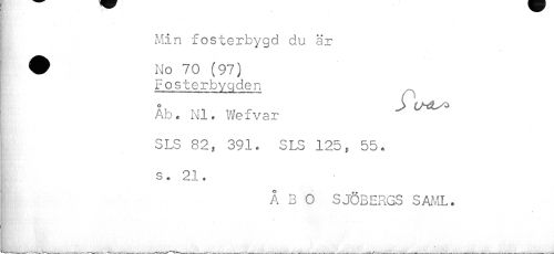 //// !;. Min fosterbygd du är //// W No 70 (97) //// Fosterbygder. //// ° S U-dL/Z //// Ab. NI, Wefvar //// SLS 82, 391. SLS 125, 55. s. 21. //// ÅBO SJÖBERGS SAML. //// [ , . ' .. ^ ... ////