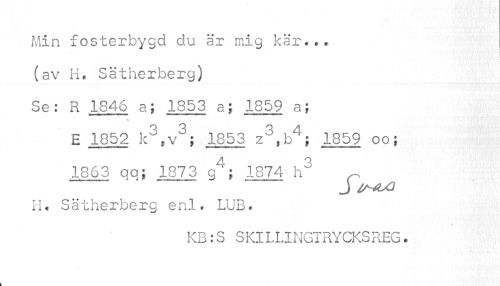 //// Min fosterbygd du är mig kär... //// (av H, Sätherberg) //// Se: R .1846 a; 1853 a; 1859 a; //// E 1852 k3,v3; 1853 z3,b4; 1859 oo; 1863 qq; 1873 g4; 1874 h3 n //// J lA^Ul //// H. Sätherberg enl. LUB. //// KB:S SKlLLINGTRYCKSREG. //// k ////