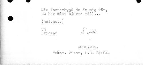 //// Min fosterbygd du är mig kär, du hör mitt hjerta till... //// ^^ (mel. no t.) //// Fristad c) //// NORD. MUS. //// I Msfapt. Visor, E.U. 31204. //// _ ^ ////