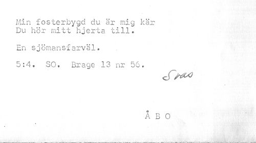 //// Min fosterbygd du är mig kär Du hör mitt hjerta till. //// En sjömansfarväl. //// 5:4. SO. Brage 13 nr 56. //// cTa^ //// ÅBO //// « //// » ////