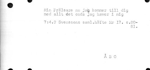 //// I Min Frälsare nu jag kommer till dig //// med allt det onda jag haver i mig //// 7:4,? Svenssons saml.häfte Nr 17. s.SO- //// SI. //// ÅBO ////