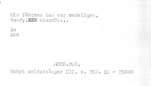 //// Min fästman han var modeligen, dandy*iSQÖf charmör*., //// Bo Bro //// NORD.MUS. //// Mskpt soldatsånger III, s. 256. EU = 25040 ////