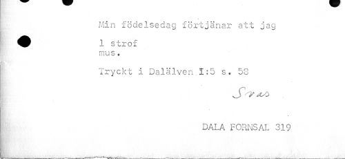 //// j Min födelsedag förtjenar att jag //// ^^ 1 strof //// ! mus, //// i Tryckt i Dalälven.1:5 s. 58 //// < //// * //// I //// DALA F ORNS AL 319 ////