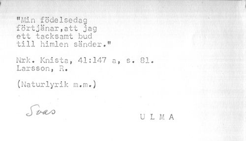 //// "Min födelsedag förtjänar,att jag ett tacksamt bud till himlen sänder." //// Nrk. Knista, 41:147 a, s. 81. Larsson, R. //// (Naturlyrik m.m.) ^ U L M A ////