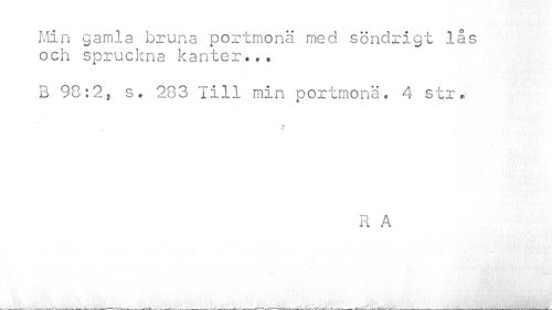 //// Min gamla bruna portmonä med söndrigt lås och spruckna kanter... //// B 98:2* s. 283 Till min portmonä. 4 str» //// # * //// R A ////