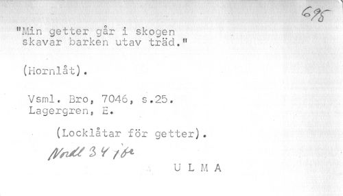 //// "Min getter går i skogen //// skavar barken utav träd." //// (Hornlåt). //// Vsml, Bro * 7046, s*25. Lagergren, i* //// (Locklåtar för getter) . //// U L M A ////