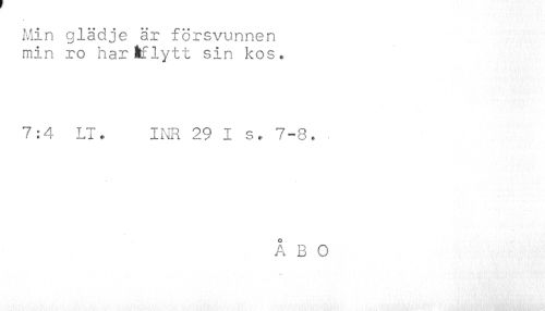 //// Min glädje är försvunnen min ro har Iflytt sin kos. //// 7:4 LT. INR 29 I s. 7-8. //// ÅBO //// •k ////