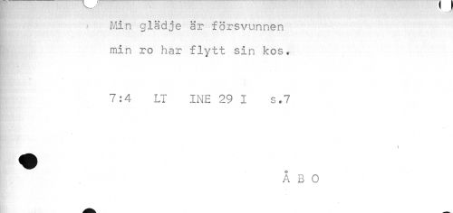 //// Min glädje är försvunnen min ro har flytt sin kos. //// | 7:4 LI INE 29 I s.7 //// i t //// ÅBO ////