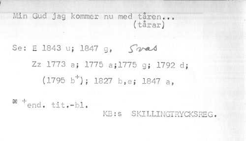 //// Min Gud jag kommer nu med tåren... //// (tårar) //// Se: E 1843 u; 1847 g, ^ns-euA //// Zz 1773 a; 1775 a;1775 g; 1792 d; (1795 b+)j 1827 b,e; 1847 a, //// 38 ' end. tit»-bl. //// I<B: s SKILLINGT RYCKS RE G ? ////