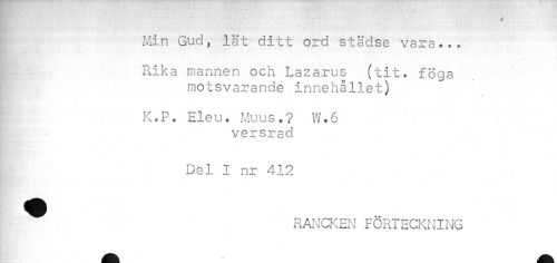 //// ¦ //// Min Gud, lät ditt ord städse vara*.* //// v »<•• //// Rika mannen och Lazarus (tit. föga //// motsvarande innehållet) //// K*P. Hleu. Muus.? W.6 //// versrad //// Del I nr 412 //// ^ RANCKEN FÖRTECKNING ////