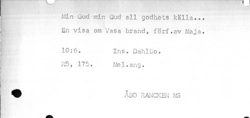 //// |: Min Gud min Gud all godhets källa... //// j En visa om Vasa brand, förf.av Maja. //// S' ' //// 10:6. Ins. Dahlbo. //// |i R5» 175. Mel. ang. //// o //// ÅBO RANCKEN MS //// V ////