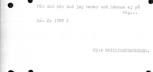 //// W Min Gud min Gud jag beder ack hämnas ej på //// mig. .. //// ¦ //// Se: Zz 1787 f //// KB:s SKILLINGTRYCKSREG. //// i ////