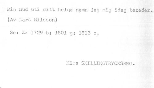 //// Min Gud uti ditt helga namn jag mig idag bereder. (Av Lars Nilsson) //// Se: Zz 1729 b; 1801 g; 1813 c, //// ¦ •• //// KB:s SKlLLINGTRYCKSREG. //// k ////