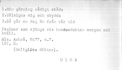 //// ¦ //// ¦ //// 1»Min gärning nådigt skåda 2tVälsigna mig och skydda 3»Så går en dag än från vår tid //// i //// Psalmer som sjöngs vis husdandakten morgon och kväll. //// Hls. Arbrå 3 8677, s.7* Löf s £. //// i //// (Religiösa dikter)* //// U L M A //// i ////