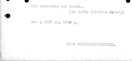 //// Min hedersdag var innel.. //// (av Julia Kristina Nyberg) //// ^H Hr //// Se: E 1837 bbj 1849 p, //// i • //// I //// KB:s SKILLINGTRYCKSREG. //// i ////