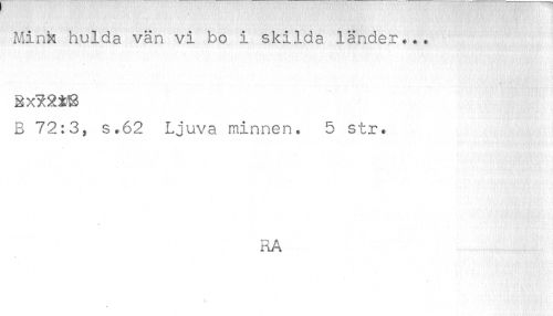//// Mink hulda vän vi bo i skilda länder... i® //// B 72:3, s.62 Ljuva minnen. 5 str. //// RA //// > ////