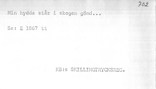//// r VNL //// ' nt //// Min hydda står i skogen gömd...» //// < //// Se: E 1867 tt //// i //// i ¦ //// ; //// I ! //// V • //// ; | //// i //// •i i //// I //// KB:s SKlLLINGTRYCKSREG. //// ; //// > //// I //// I ////
