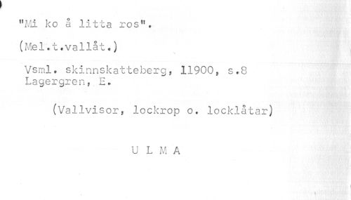 //// "Mi ko å litta ros11. (Mel.11vallat.) //// \ //// Vsml. skinnskatteberg, 11900, s.8 Lagergren? E. //// (Vallvis or, lockrop o. locklatar) //// U L M A //// | //// I ////