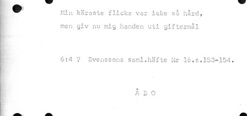 //// ^^ Min käraste flicka var icke så hård, //// men giv nu mig handen uti giftermål //// 0 //// t //// 6:4 ? Svenssons saml.häfte Nr 16-s,153-154, f ÅBO //// r " * //// åk fe m ////