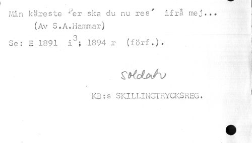 //// Min käreste "Jer ska du nu res' ifrå mej..» //// (Av S .A.Hammar) | //// i //// Se: E 1891 i3; 1894 r (förf.). //// i I //// i //// KB:s S KlLLINGTRYCKS REG. 1 ////