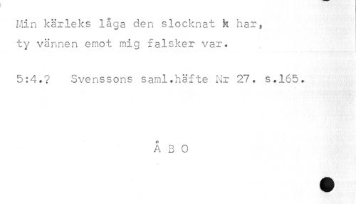 //// Min kärleks låga den slocknat k har, //// ty vännen emot mig falsker var. ! //// 5:4.? Svenssons saml.häfte Nr 27. s.165. //// * //// ÅBO ////