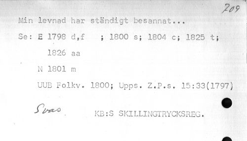 //// /-ffr //// Min levnad har ständigt besannat... //// i //// i //// Se: e 1798 d,f ; 1800 s; 1804 c; 1825 t; //// # //// 1826 aa N 1801 m //// UUB Folkv. 1800; Upps. Z.P.s, 15:33(1797) //// . KB :S SKI LLINGTRYCKS REG. //// « ////