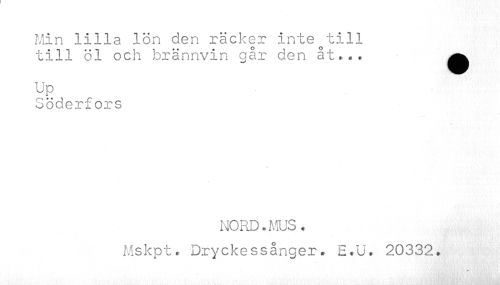 //// Min lilla lön den räcker inteotill //// till öl och brännvin går den åt... ^ //// Up //// Söderfors //// //// /NORD.MUS « Mskpt. Dryckessånger. E.U. 20332. ////