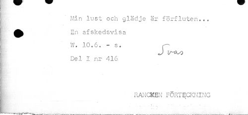 //// Min lust och glädje är förfluten... //// % //// ¦rv w //// ^^ En afskedsvisa //// [. W. 10.6. - s. p //// J 1S-CO0 //// ' Del I nr 416 //// RANCKEN FÖRTECKNING ////