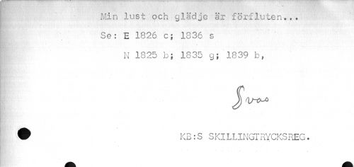 //// Min lust och glädje är förfluten... //// !« //// JP l; . //// Se: E 1826 c; 1836 s //// * //// | N 1825 b; 1835 g; 1839 b, //// W KB:S SKILLINGTRYCKSREG. //// w •• . • ////