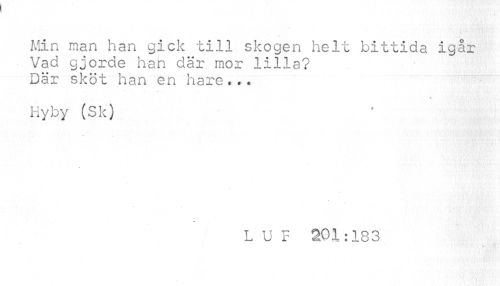 //// Min man han gick till skogen helt bittida igår Vad gjorde han där mor lilla? Där sköt han en hare... //// Hyby (Sk) //// » //// % //// L U F 201:183 ////
