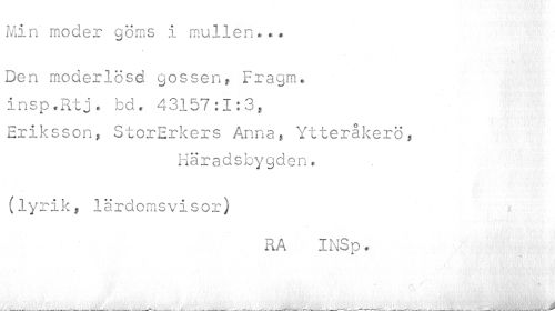 //// Min moder göms i mullen*.* //// v //// Den moderlösd gossen, Fragm*. insp.Rtj. bd« 43157:1:3, Eriksson, StorErkers Anna, Ytteråkerö, //// Häradsbygden, //// (lyrik, lärdomsvisor) //// RA INSp. //// r. y //// * . ////