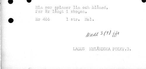 //// Min mor spinner lin och blånad, Far är långt i skogen, //// I" //// •Nr 466 1 str. Mel. //// I * få //// LAGUS NYLÄNDSKA FOLKV.3. //// i ////