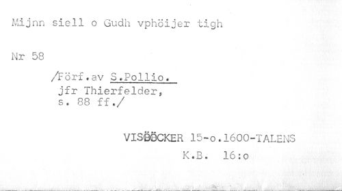 //// Mijnn siell o Gudh vphöijer tigh Nr 58 //// /Förf.av S.Pollio. //// jfr Thierfelder, s. 88 ff. //// /VISBÖCKER 15-o.1600-TALENS //// K.B. 16:o //// ¦ -'s ////