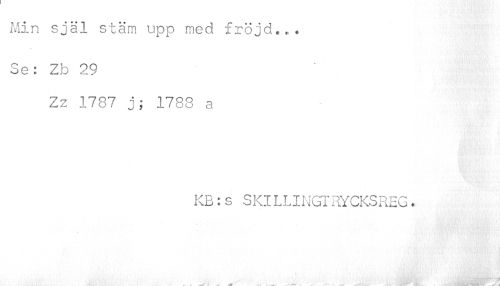 //// Min själ stäm upp med fröjd... //// Se: Zb 29 //// Zz 1787 j; 1788 a //// KB:s SKlLLINGTRYCKSREG. ////