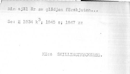 //// Min själ är av glädjen förskjuten..,. //// Se: E 1834 k3; 1845 s; 1847 zz //// « //// KB:s SKILLINGTRYCKSREG. //// i ////