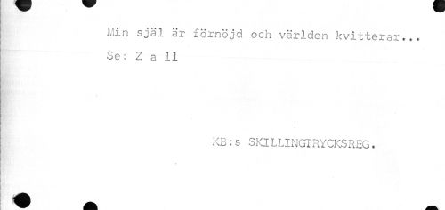 //// r Min själ är förnöjd och världen kvitterar... //// Se: Z a 11 //// KB:s SKlLLINGTRYCKSREG. //// * //// i A ////