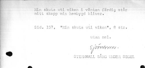 //// 1 //// 1 Min skuta uti viken i väntan färdig står //// mitt skepp min hembygd bliver. //// Sid. 157, "Min skuta uti viken", 8 str. | utan mel. //// ijQ7Y!£fYrYV < //// I STERNWALL SANG UNDER SEGEL //// ^flll^Éfc ////