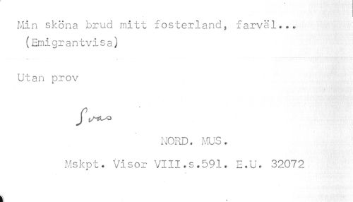 //// Min sköna brud mitt fosterlands farväl... //// (Emigrantvisa) Utan prov //// % //// NORD. MUS. Mskpt. Visor VIII.s.591. E.U. 32072 //// k ////