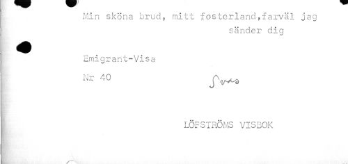 //// Min sköna brud, mitt fosterland,farväl jag 1 sänder dig //// I Emigrant-Visa //// Nr40 jv* //// LÖFSTRÖMS VISBOK ////
