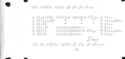 //// ^^ Min snälla hyvel gå på gå på.,, //// * //// B 11, s.163 Snickar Gossens Sång. 6 str. //// B 53:2,s.80 " " " 8 str.,kom. //// A 41:10 " " " 6 str. //// A 141:67 Snickargossen. o 7 str. //// A 212:2 Snickargossens sång, 9 str.,not. //// A 464:2 Snickargossen 9 str. //// Jfr Du snälla hyvel gå på, gå på.... //// RA //// % ////