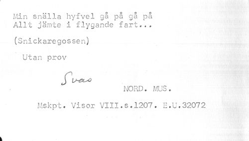 //// Min snälla hyfvel ga på gå på Allt jämte i flygande fart... //// (Snickaregossen) //// Utan prov //// « //// NORD. MUS. Mskpt. Visor VIII.s.1207. E.U.32072 //// - - v //// I ////