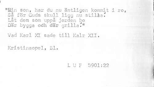 //// "Min son» har du nu äntligen kommit i ro, Så för Guds skull ligg nu stil&a? Låt dem som uppå jorden bo //// Där bygga odh där grilla'" j //// Vad Karl XI sade till Kalr XII. //// • i 'i* //// Kristinaopel, Bl. //// ¦ //// L U F 5901:22 J ////